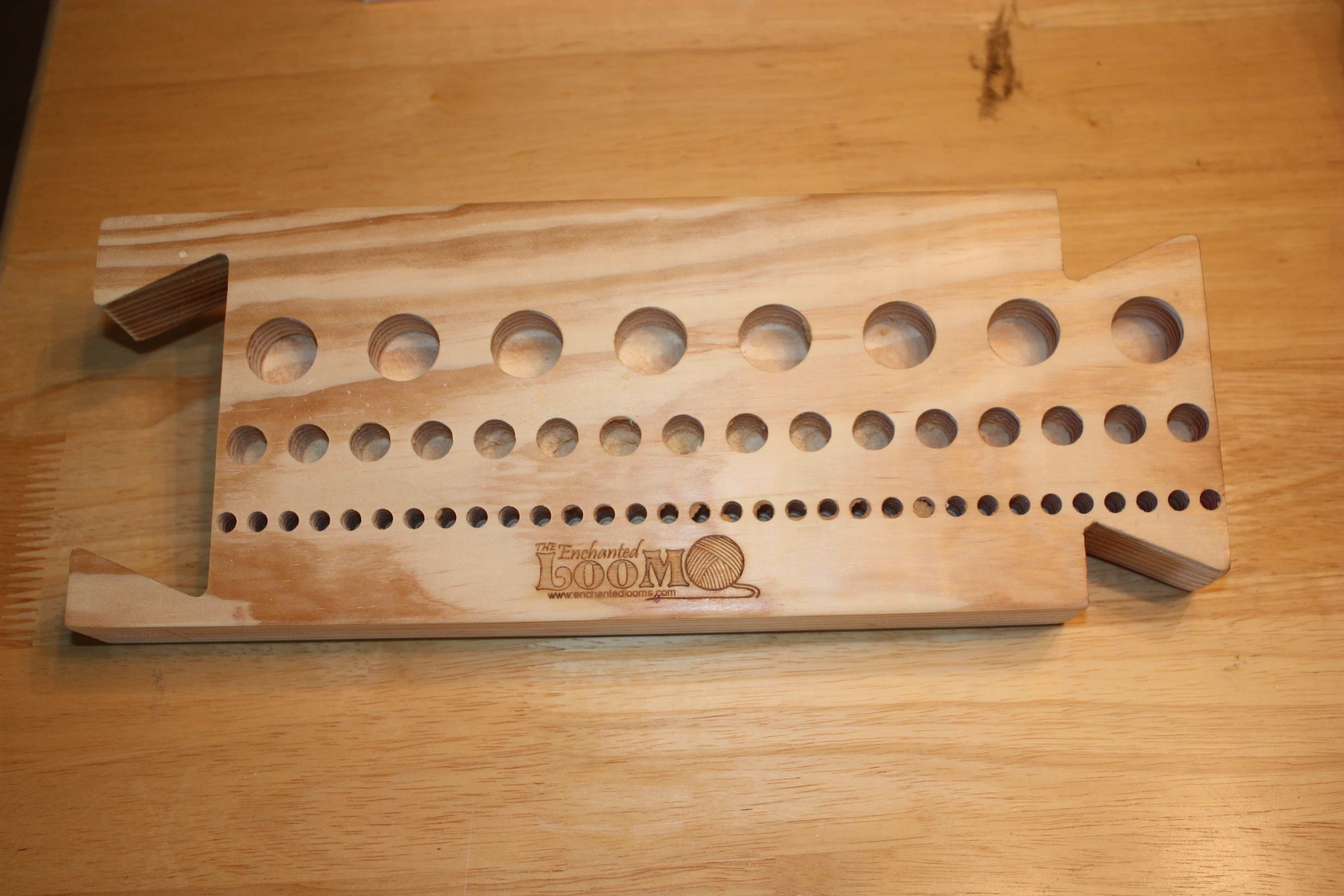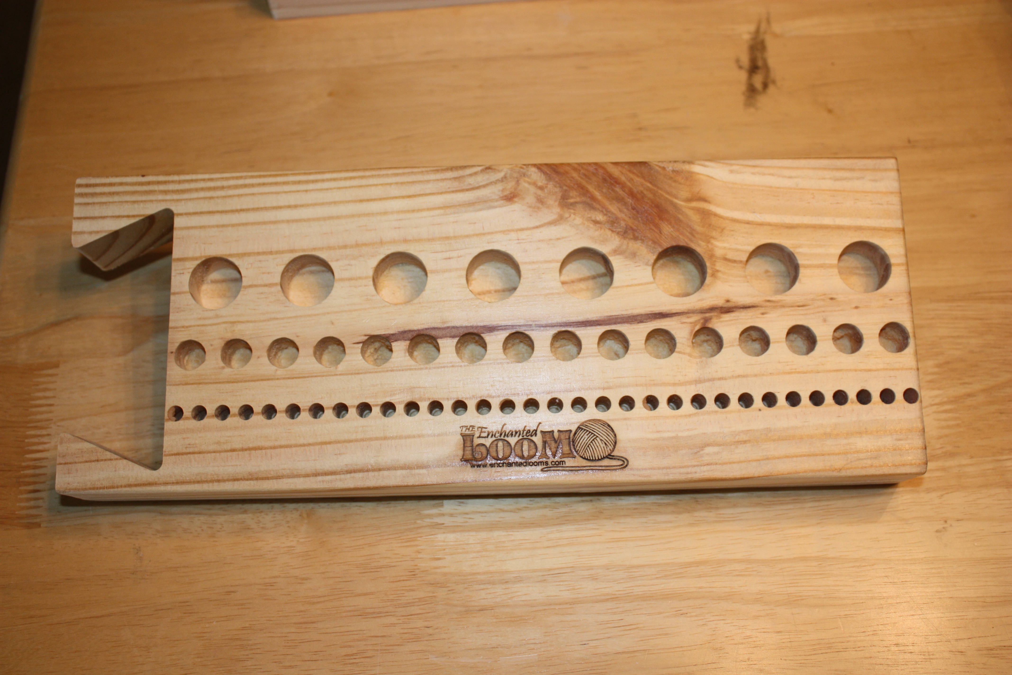 This is our center loom. The Loom is made from 1 1/2 inch thick pine. This versatile loom has 8 large holes, 16 medium holes, and 32 smaller holes. This loom increases the size of the loom to 3 times the size or larger, depending on how many you use, add to the left and right loom sections.
